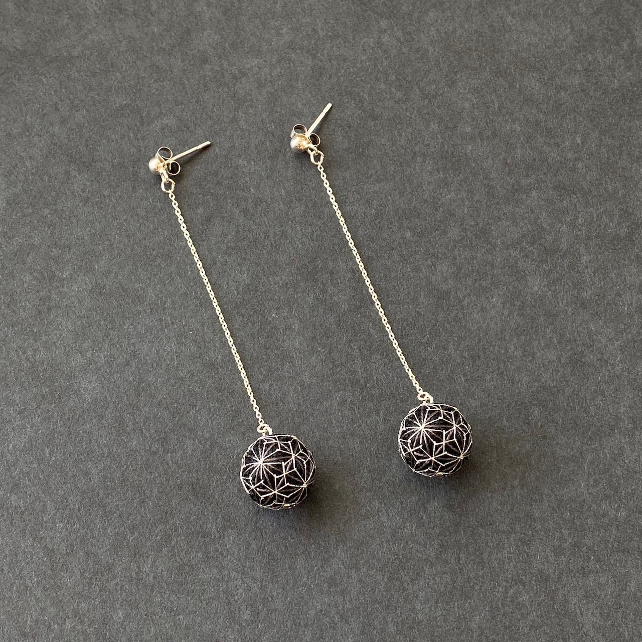 ASANOHA 手まり耳飾り チェーン 黒 銀糸