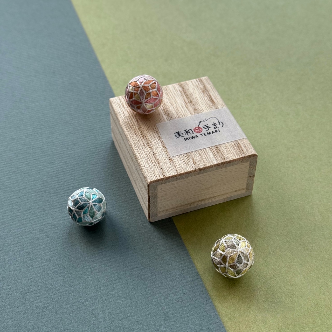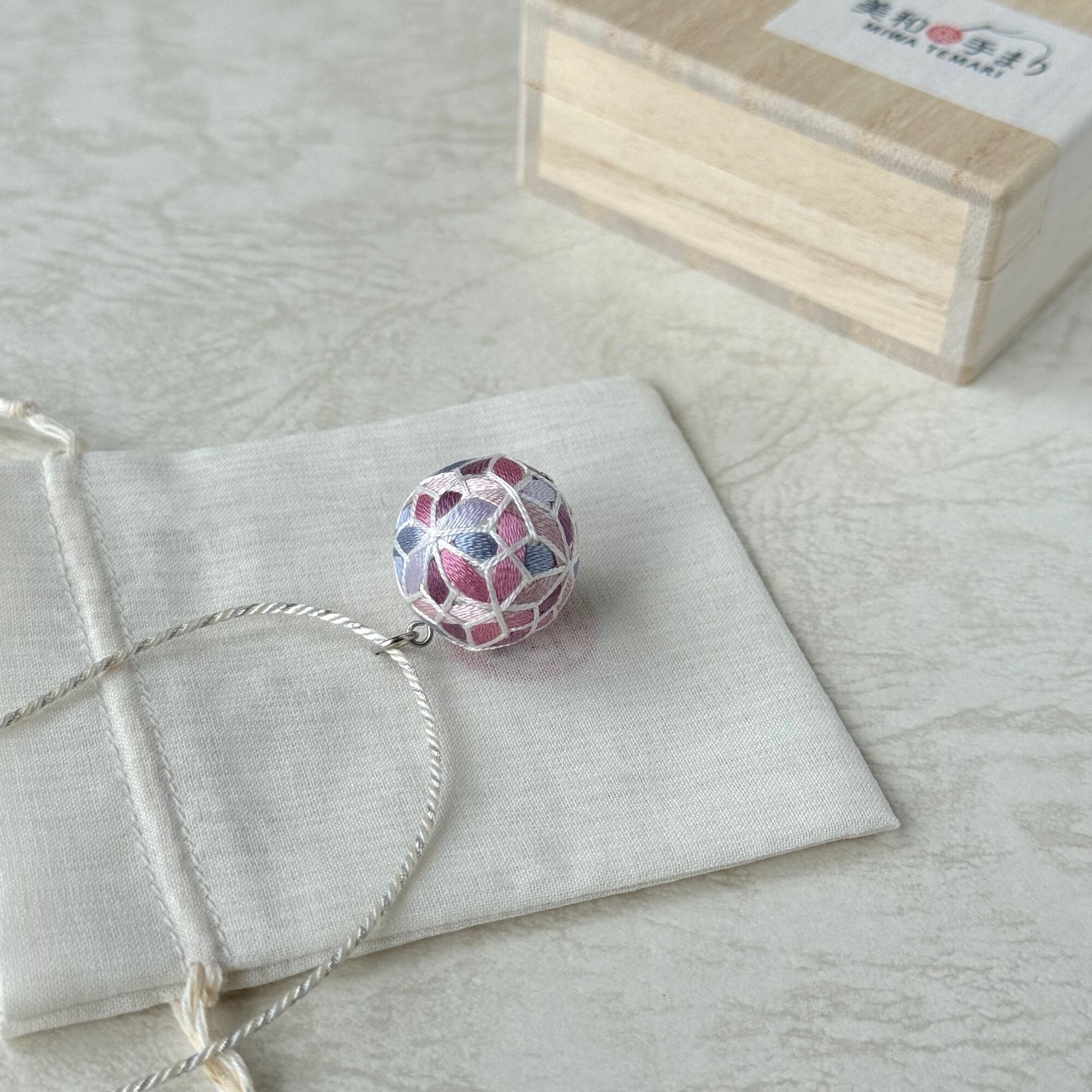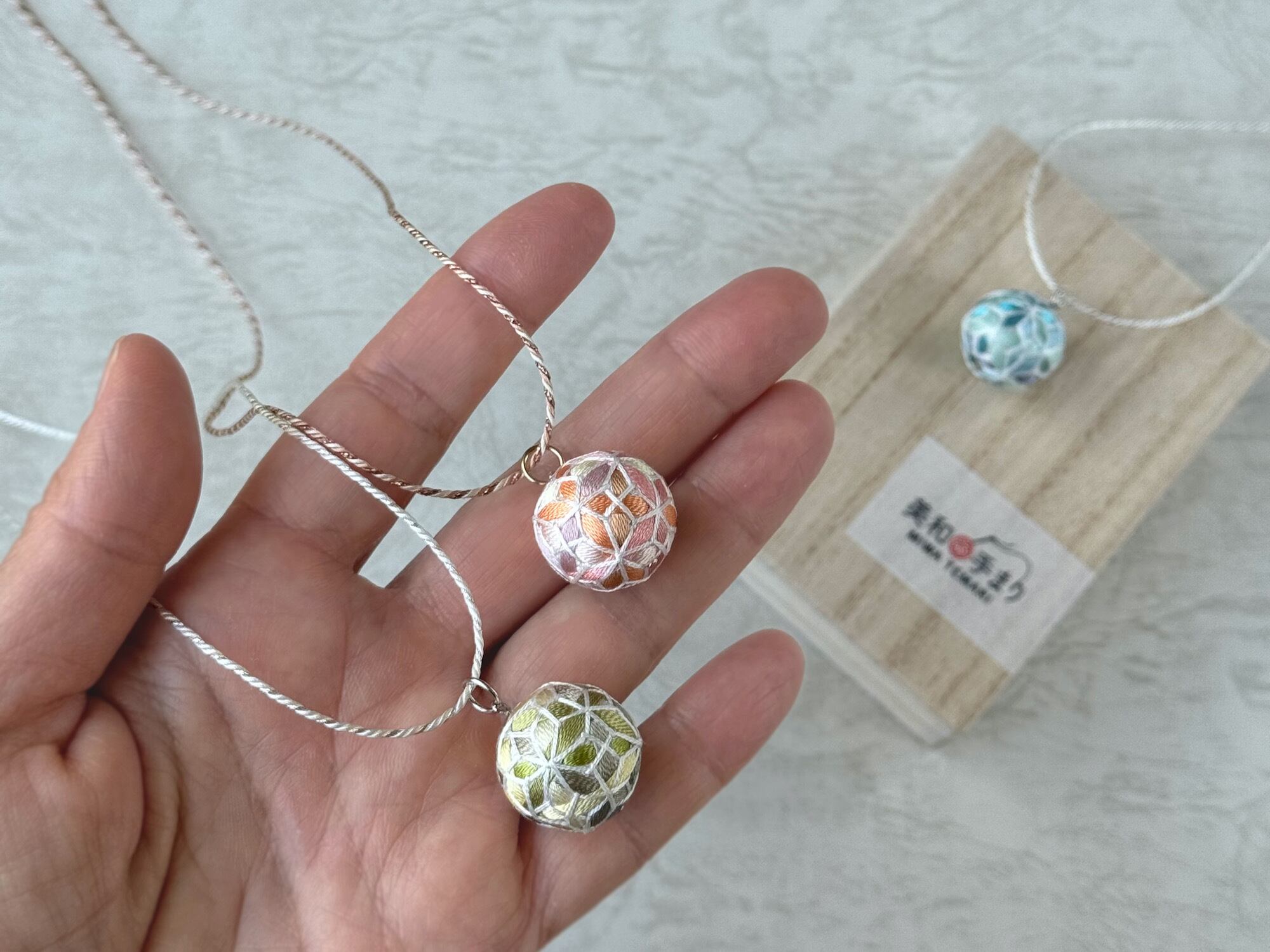 日本の伝統工芸《手まり》がジュエリーとして生まれ変わりました。麻の葉、菊、桜など、古来より人々に愛されてきた模様を、現代の感性に合わせてスタイリッシュなデザインへとアレンジしました。和装、洋装どちらのスタイルにも合うおしゃれなアクセサリーです。絹糸、銀糸と本金糸を使って、ひとつひとつ丁寧な手仕事で仕上げています。